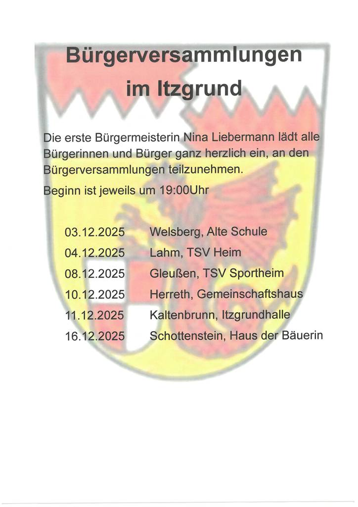 Am Mittwoch, den 12.11.2025 um 18:30 Uhr findet im Rathaus der Gemeinde Itzgrund die nächste Vorstandssitzung statt.