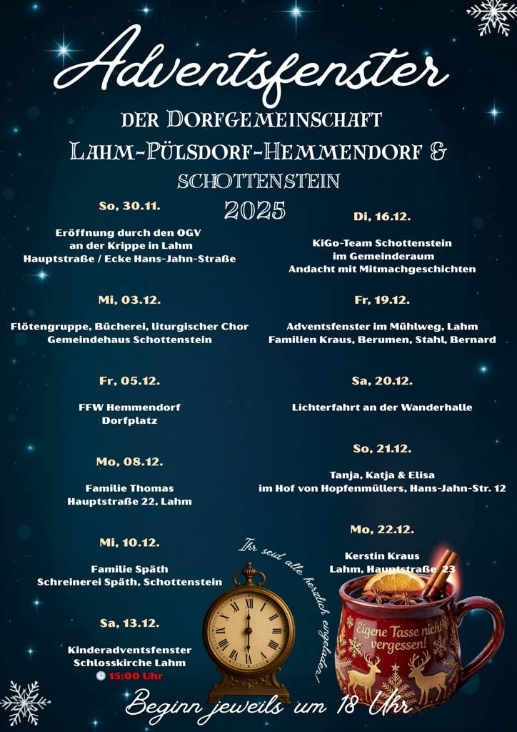 Wir würden uns freuen, wenn sich wieder private Haushalte, Vereine und Gruppen anmelden um ein Fenster zu gestalten und zu einem Abend im Dezember öffnen, um eine bessinliche Vorweihnachtszeit aufkommen zu lassen.