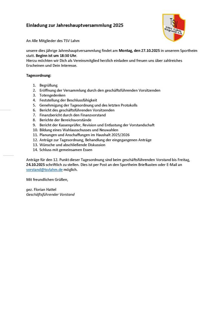 Der TSV 1961 Lahm Itzgrund e.V. lädt zur Jahreshauptversammlung ein.