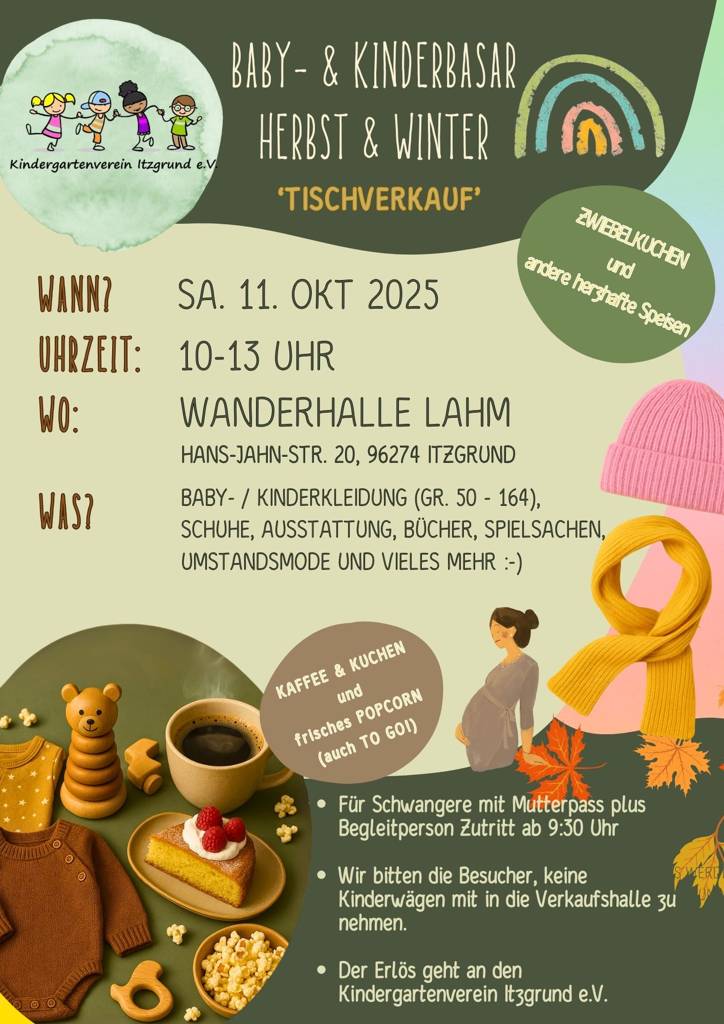 Der Kindergartenverein Itzgrund e.V. lädt in der Wanderhalle Lahm zum Baby- und Kinderbasar ein.