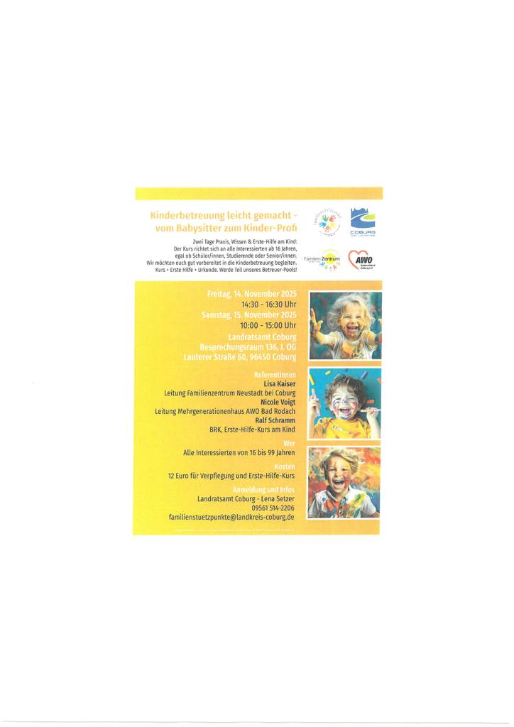Um hier gezielt Unterstützung zu bieten, organisiert das Landratsamt Coburg in Kooperation mit den Familienstützpunkten in Neustadt bei Coburg und Bad Rodach nun selbst einen Kinderbetreuungskurs, der Interessierten Wissen, Praxis-Tipps und einen Erste-Hilfe-Kurs am Kind vermittelt.