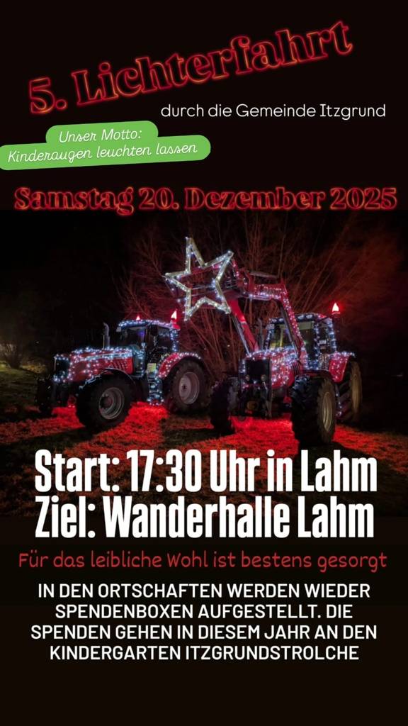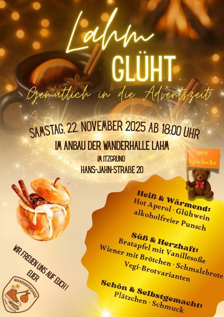 " Lahm glüht "- die Veranstaltung findet zum ersten Mal statt. Die Wanderfreunde wollen in einer lockerer Atmosphäre, mit Glühwein oder alkoholfreien Getränke, sowie mit leckeren Bratwürsten, auf die bevorstehende Adventszeit einstimmen. Ab 17.00 Uhr erwarten die Wanderfreunde an der Wanderhalle in Lahm ihre Gäste aus Nah und Fern. Der Erlös der Veranstaltung ist für den Erhalt der Wanderhalle bestimmt.